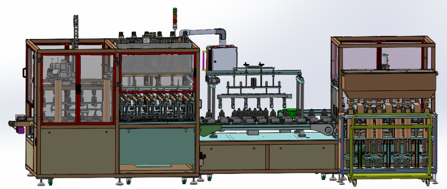 工作流程:手動放瓶—自動灌料-手動放內圈-自動壓內圈—抓手取瓶放至生產線。