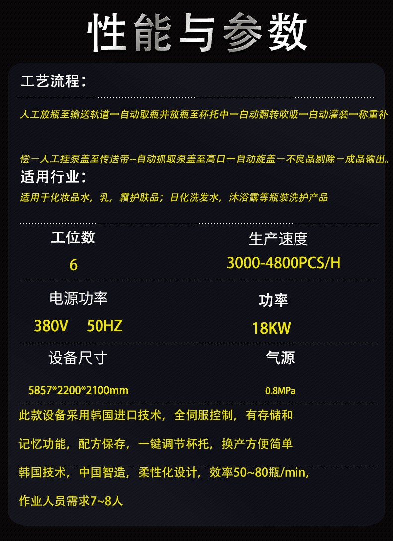 進(jìn)口技術(shù),中國制造;韓國技術(shù),中國智造,柔性化設(shè)計(jì),效率50~70瓶/min,作業(yè)人員需求7~8人;